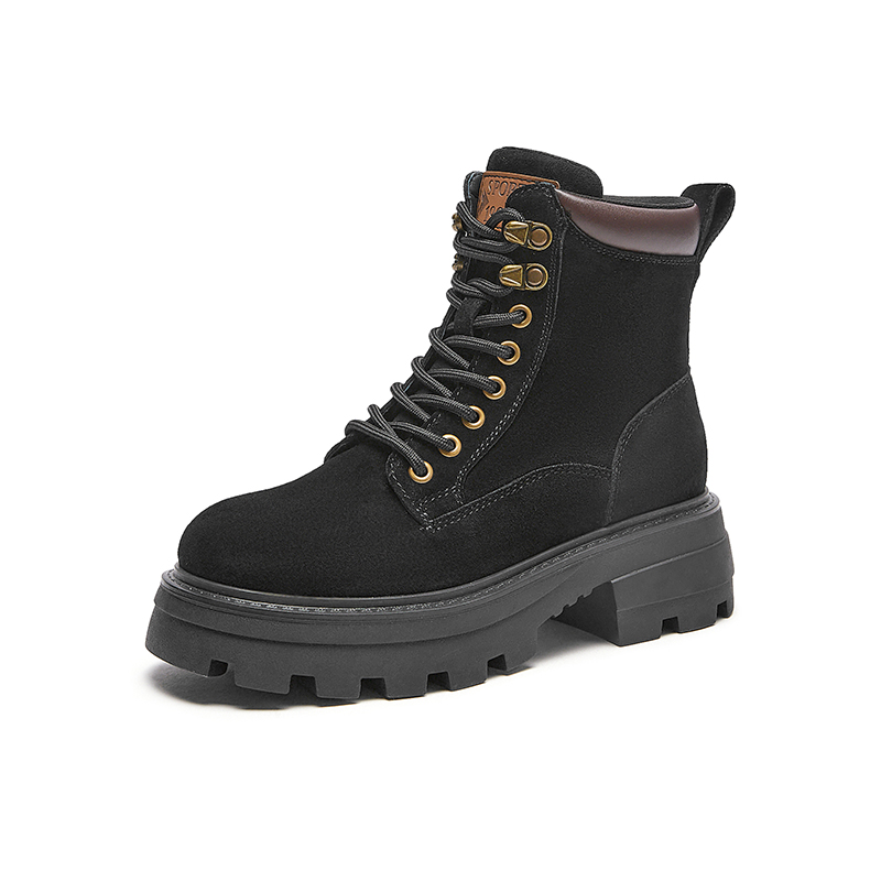 热风冬季 休闲靴拼色系带厚底黑色青年马丁靴显高靴子 女士时尚