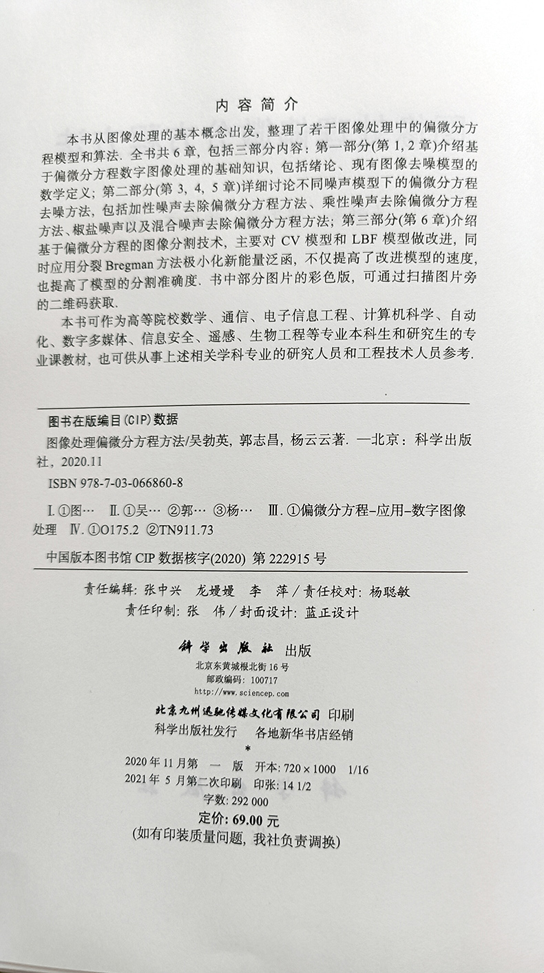杨云云 郭志昌 数字图像与数字图像处理 偏微分方程图像处理 偏微分方程方法书籍 图像处理偏微分方程方法 加性噪声去除 吴勃英
