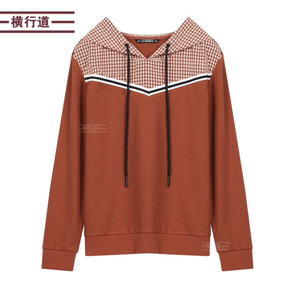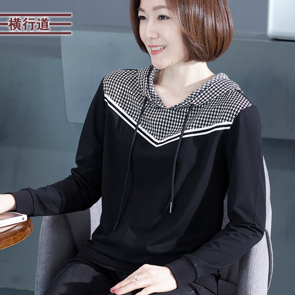 上衣 2025秋季 横行道连帽拼接千鸟格休闲黑色宽松长袖 t恤女打底衫