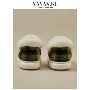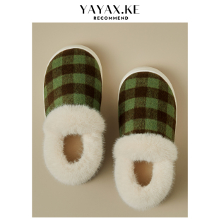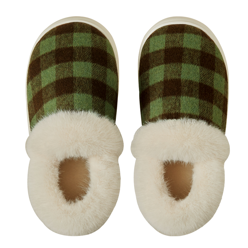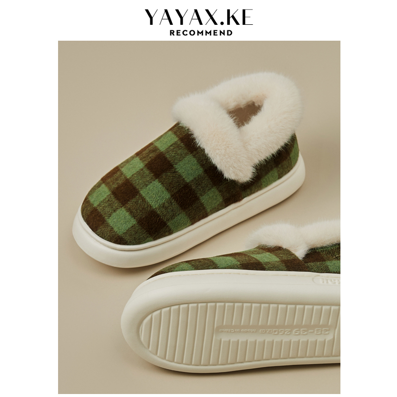 女士格子室内保暖防滑EVA底家居家用情侣毛绒棉鞋 冬季 包跟棉拖鞋