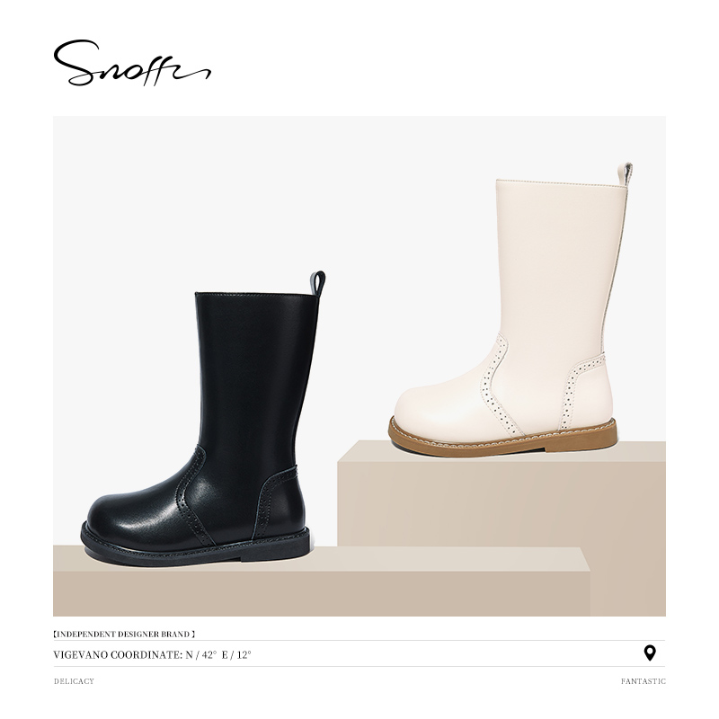斯纳菲女童靴子儿童长筒靴2025秋冬新款 黑色真皮小公主皮靴中大童