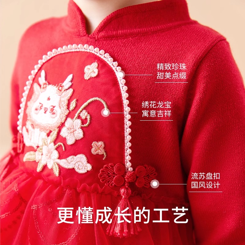 巴拉巴拉女童连衣裙宝宝公主裙儿童红色新年款 洋气裙子 旗袍秋冬季
