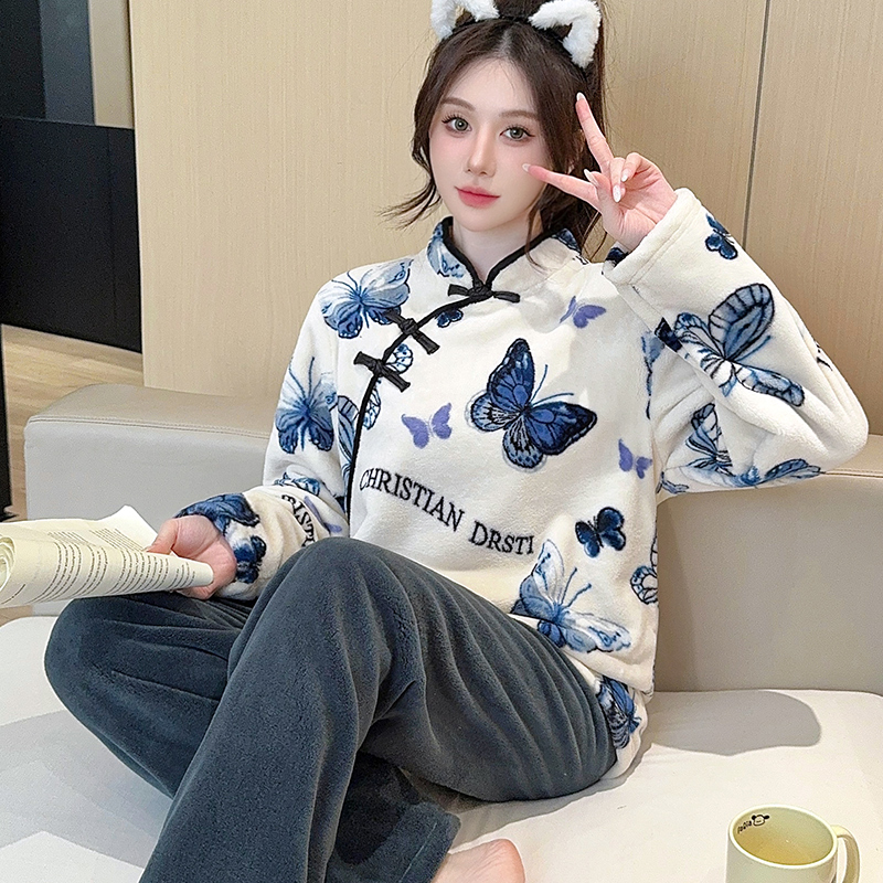 大码 春秋开衫 女士家居服 加厚珊瑚绒睡衣女冬法兰绒加绒套装 秋冬季