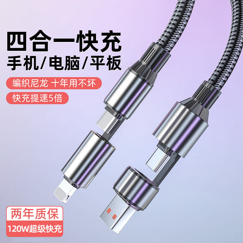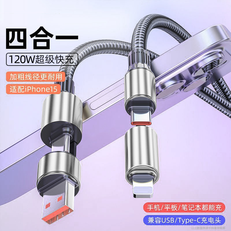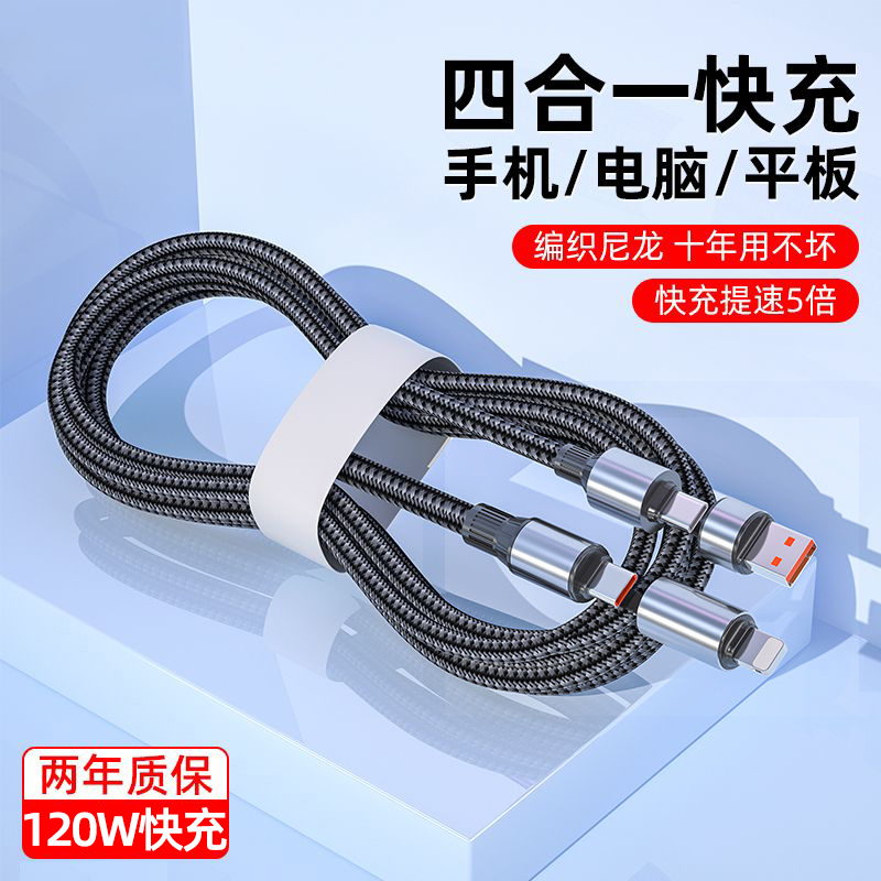 艾昊者120W超级快充数据线四合一PD65W适用苹果15华为小米OPPO双头Type c手机ipad平板车载二拖二充电器线冲