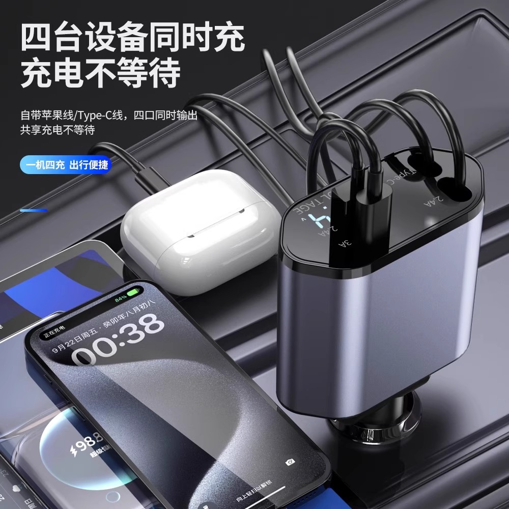 适用苹果华三合一为隐藏伸缩线手机专用120W超级快充点烟器USB头