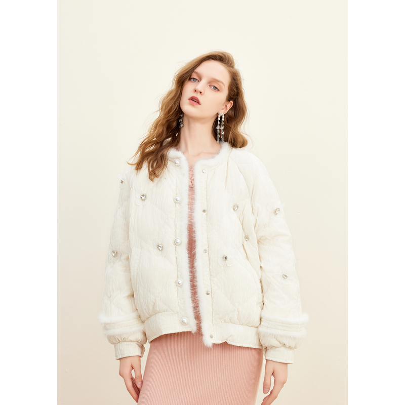 可可尼cocoon刺绣蝴蝶钉钻拼接水貂毛褶皱丝绒白色羽绒服