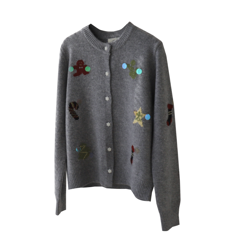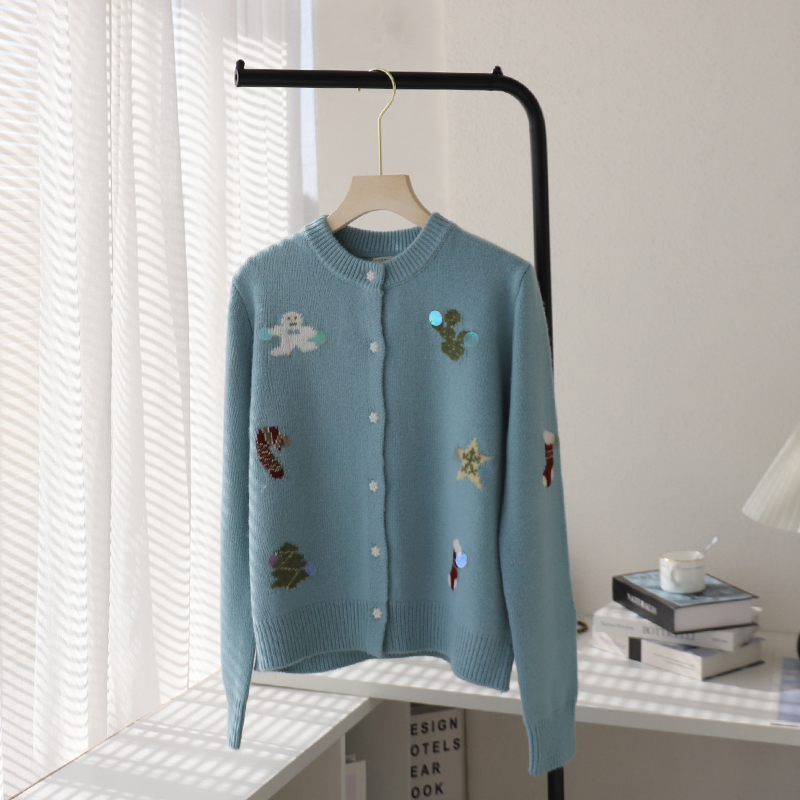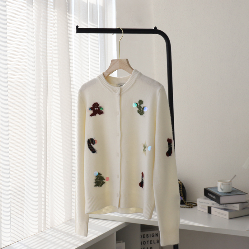 花边圆领撞色猫咪图案上衣女装 冬季 508894 女2025新款 三福毛衣开衫