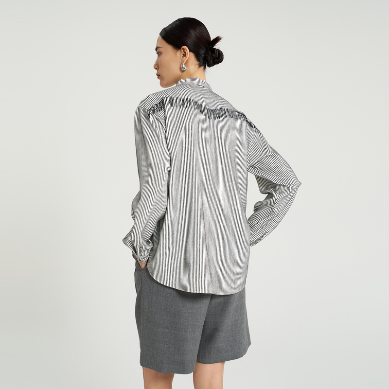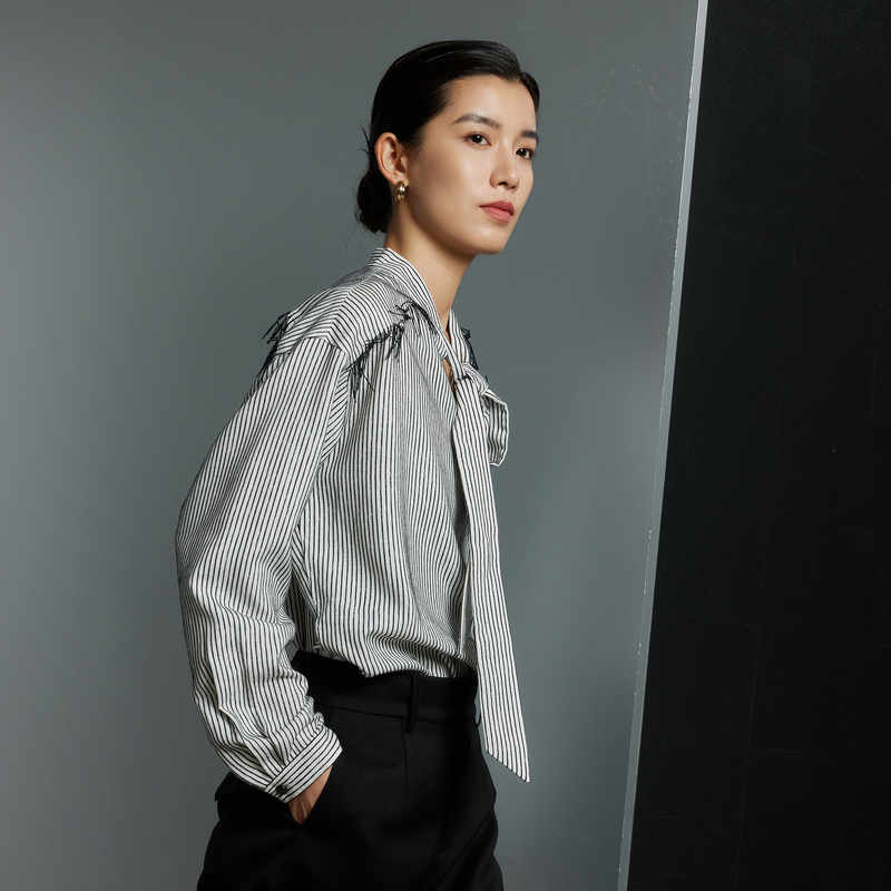 女V领宽松飘带长袖 OTT 条纹流苏衬衫 春秋新款 衬衣上衣 商场同款