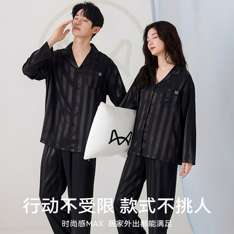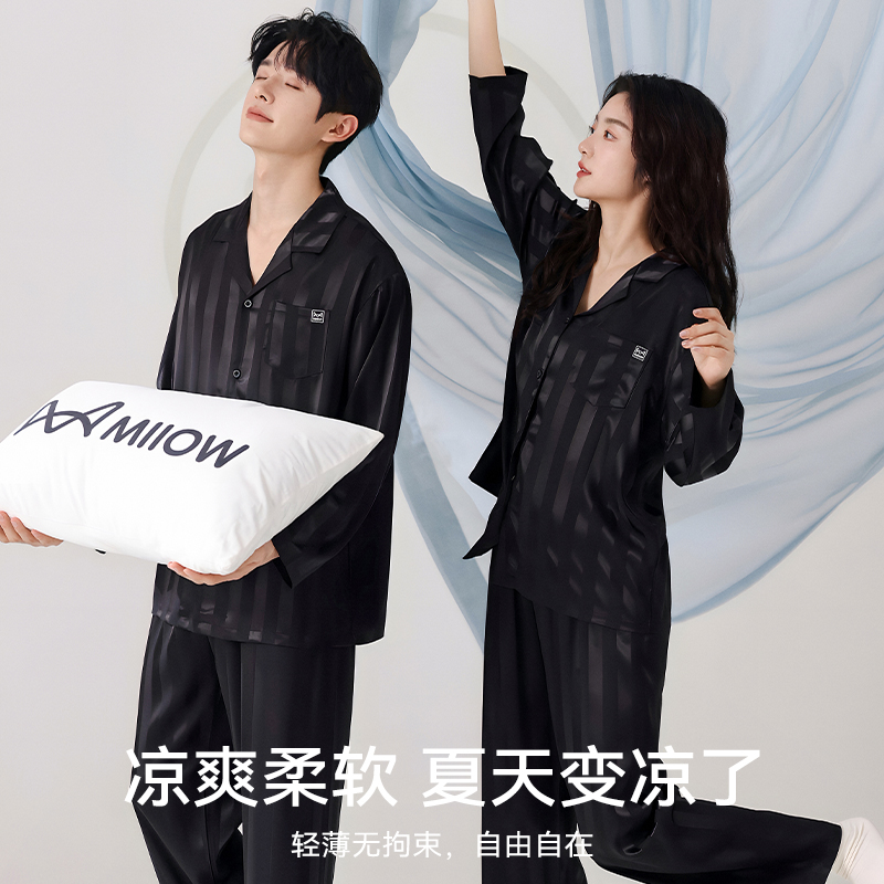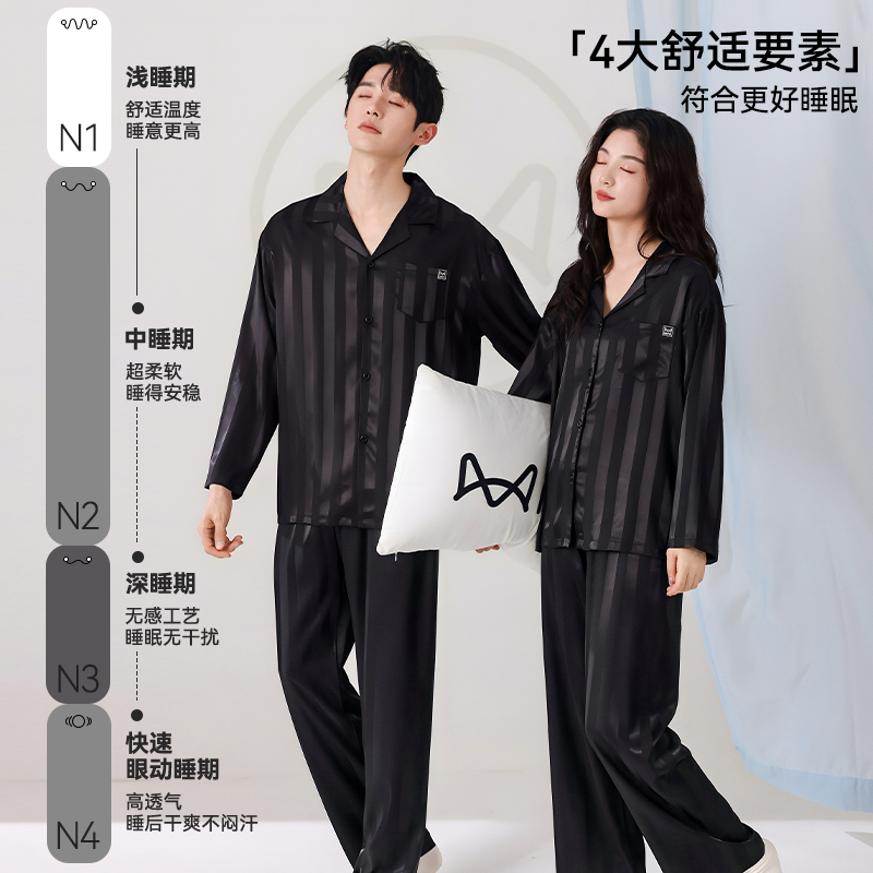 夏天凉感仿真丝绸高级感家居服女款 套装 冰丝长袖 猫人情侣睡衣男士