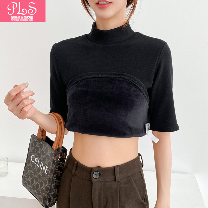 加绒加厚保暖打底衫 纯欲风燕尾T恤女装 中高领修身 秋冬新款 五分袖