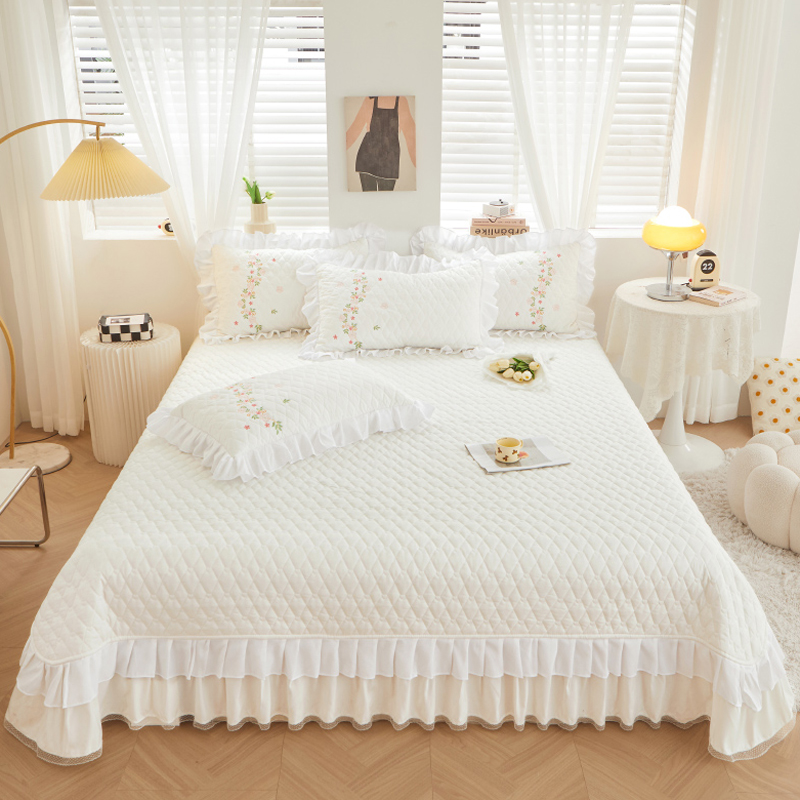 韩式 通用 花边纯色夹棉床盖单件白色公主风榻榻米床铺盖三件套四季