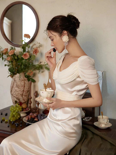 缎面轻婚纱2024新款 赫本风简约高级感出门纱草坪婚礼轻纱 新娘法式