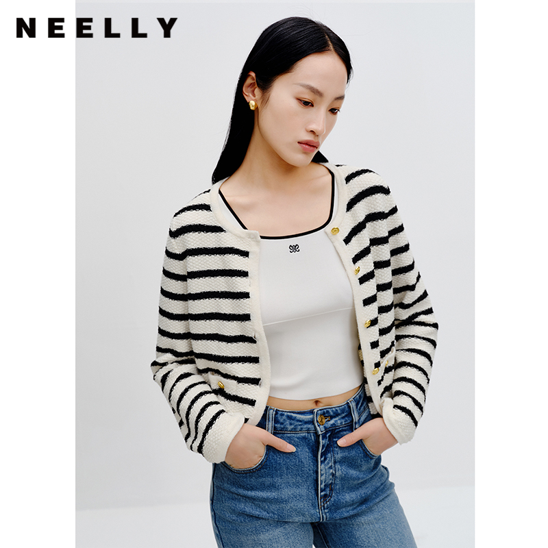 法式 NEELLY纳俪商场同款 长袖 女装 气质上衣 黑白条纹短外套早秋新款