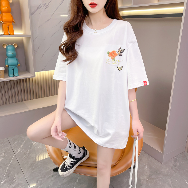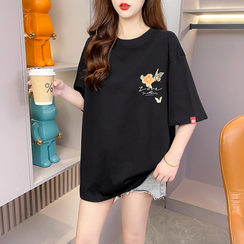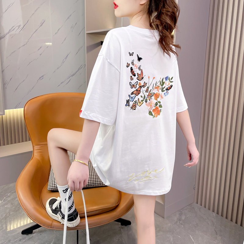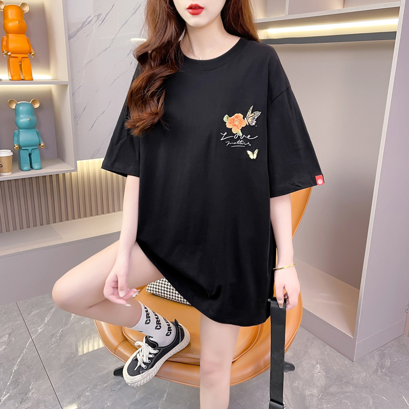 200斤纯棉爆款 胖mm大码 上衣 T恤女中长2025夏季 重工刺绣蝴蝶结短袖