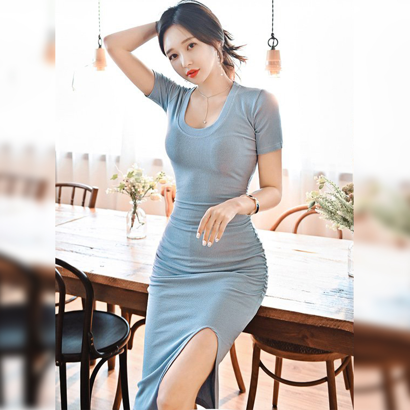显瘦紧身包臀裙韩潮 连衣裙气质修身 春夏新款 性感开叉u领褶皱短袖