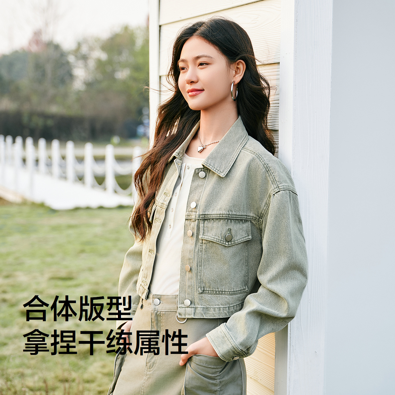 森马牛仔外套女春季 做旧复古甜酷炸街小个子上衣翻领夹克潮酷 短款