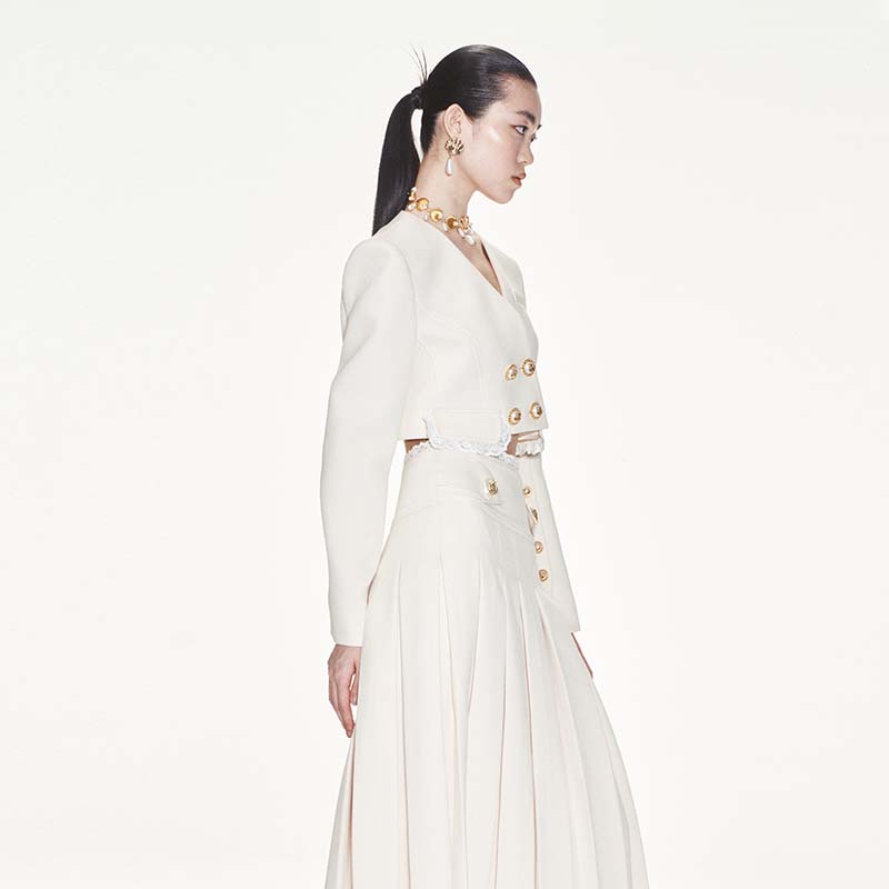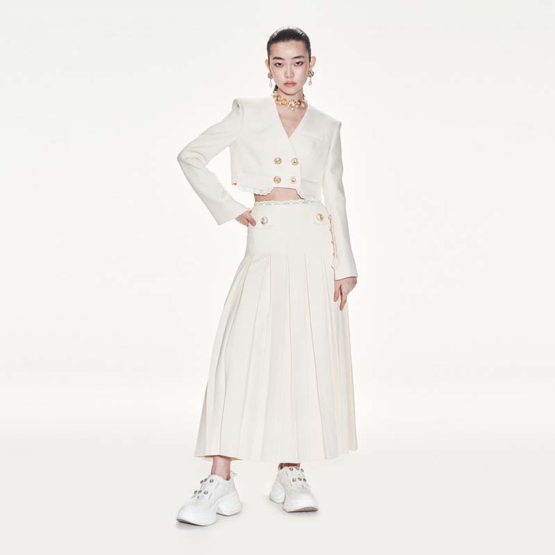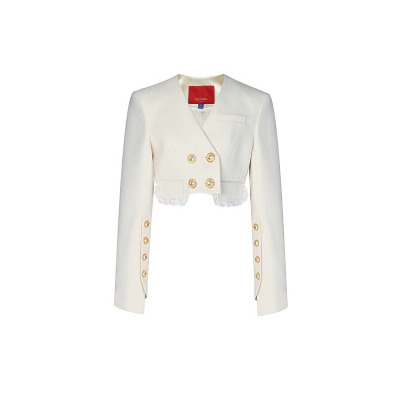 lefame拉飞姆米白色无领花边装 饰口袋短外套