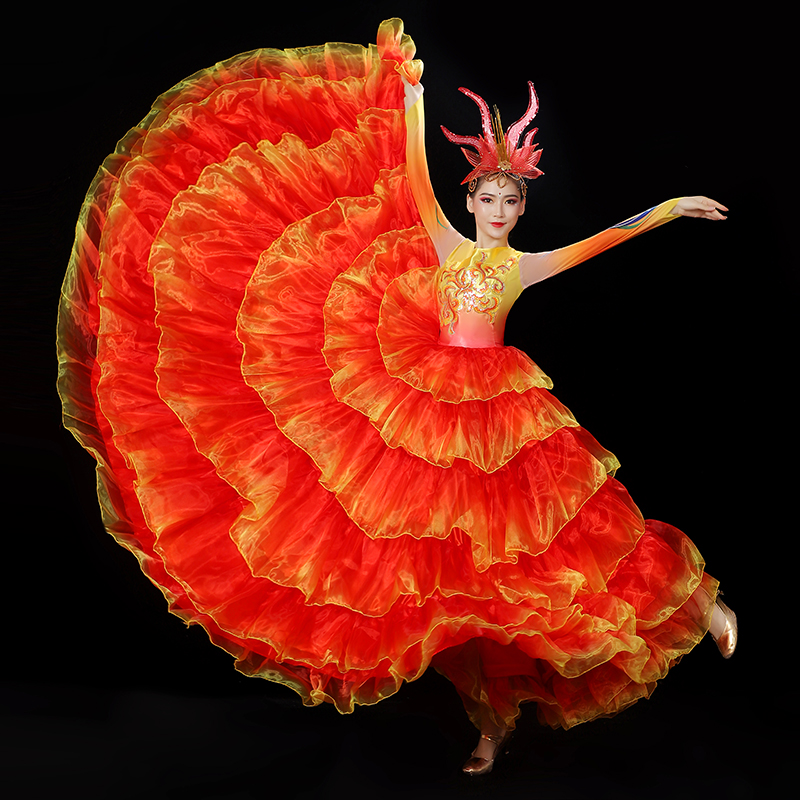 新款 女现代民族大气伴舞渐变连衣裙 舞蹈服大摆裙开场舞表演出服装