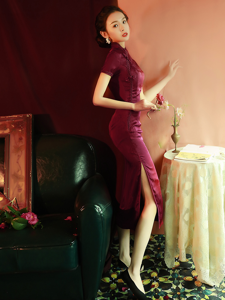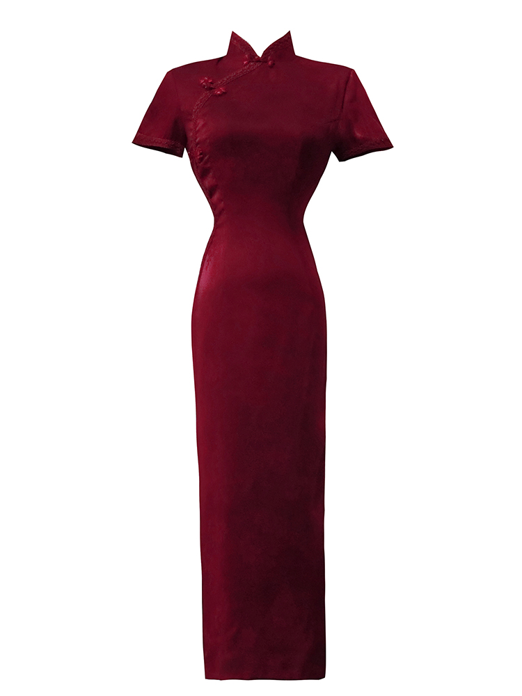 婚礼婆婆旗袍复古长款 旗袍 酒红色醋酸缎提花传统婚礼妈妈婚宴秋季