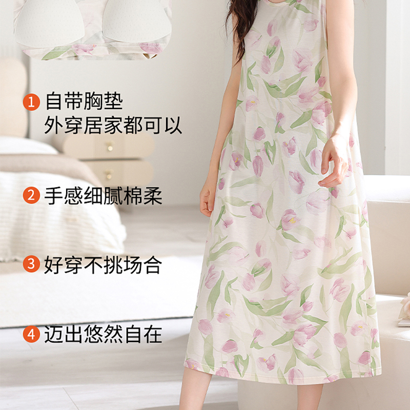 睡衣裙子家居服MP 凉感吊带背心无袖 浪莎冰丝睡裙女带胸垫夏季 新款