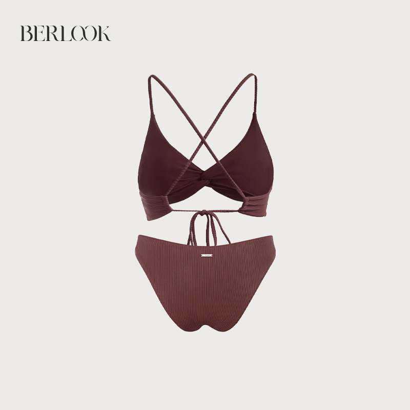 BERLOOK复古系列咖啡色V领交叉扭褶系带性感比基尼沙滩海岛度假