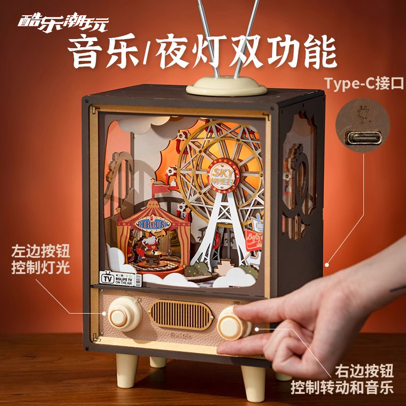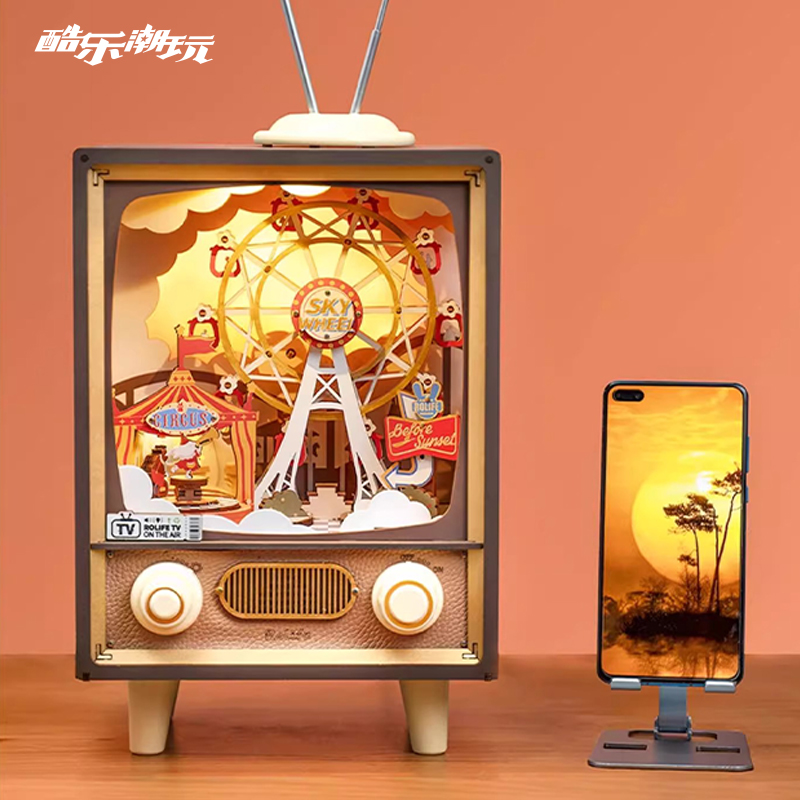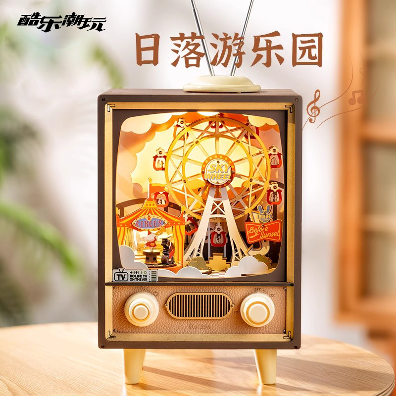酷乐潮玩DIY八音盒日落游乐园氛围夜光音乐盒充电木质玩具送礼物