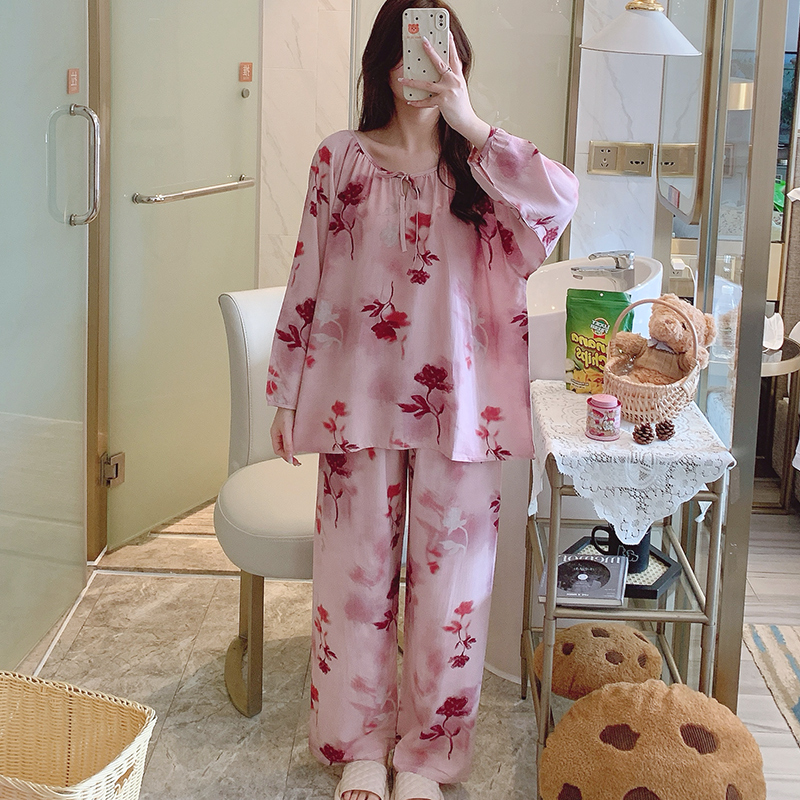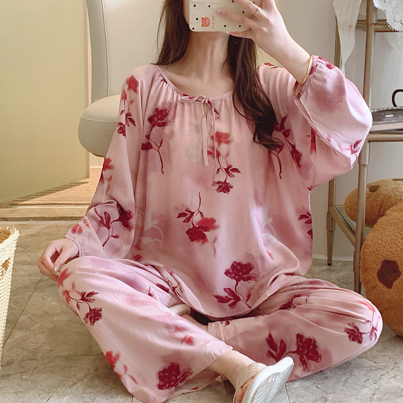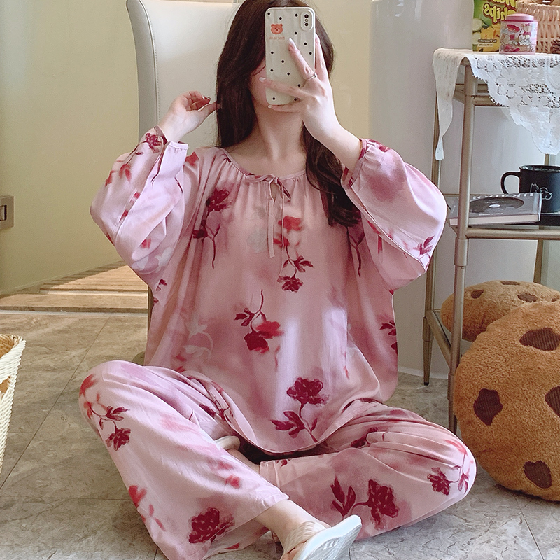 棉绸睡衣女夏季 宽松凉感人造棉绵绸可爱胖MM玫瑰家居服可爱春 薄款