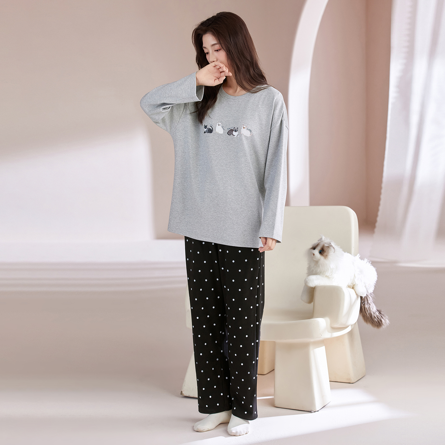 可外穿家居服套装 宜而爽秋季 休闲带胸垫一体式 长裤 纯棉睡衣女长袖