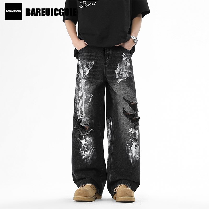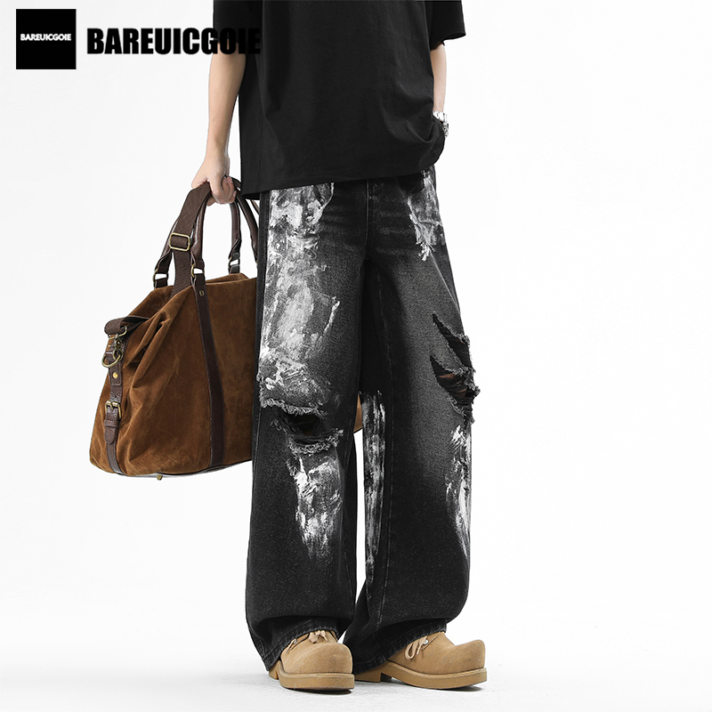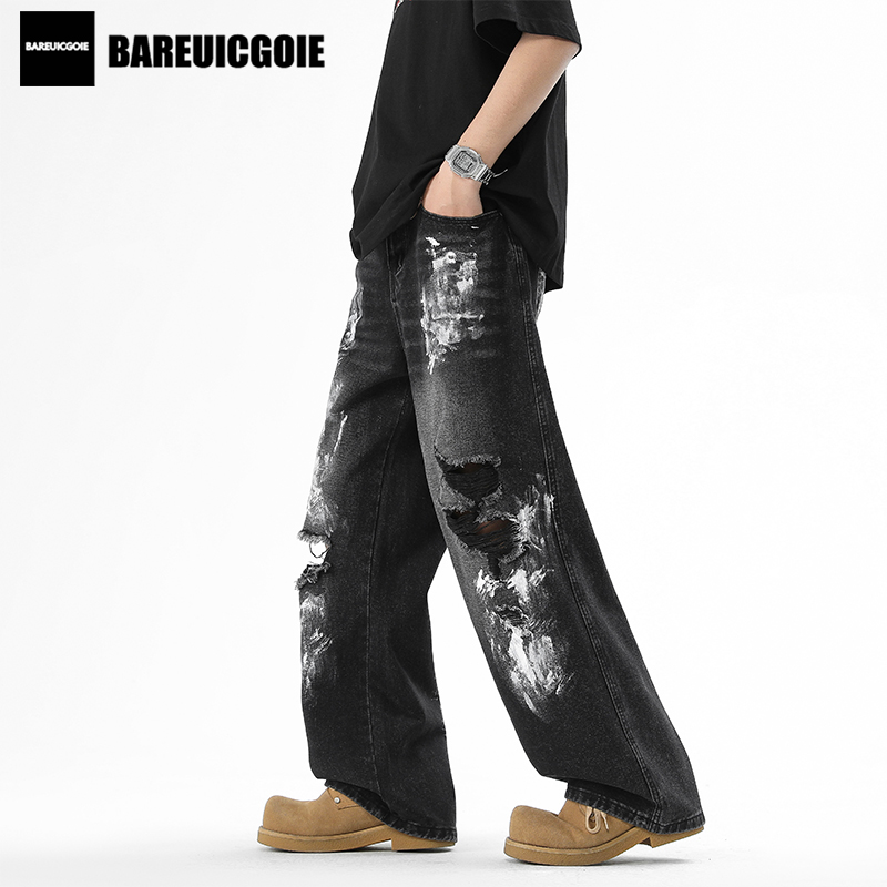 子宽松直筒阔腿长裤 cleanfit白色牛仔裤 高街潮流排扣裤 美式 男秋季