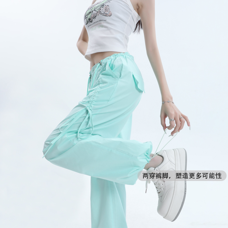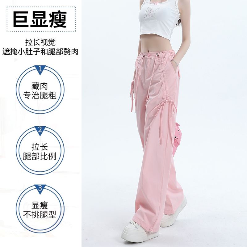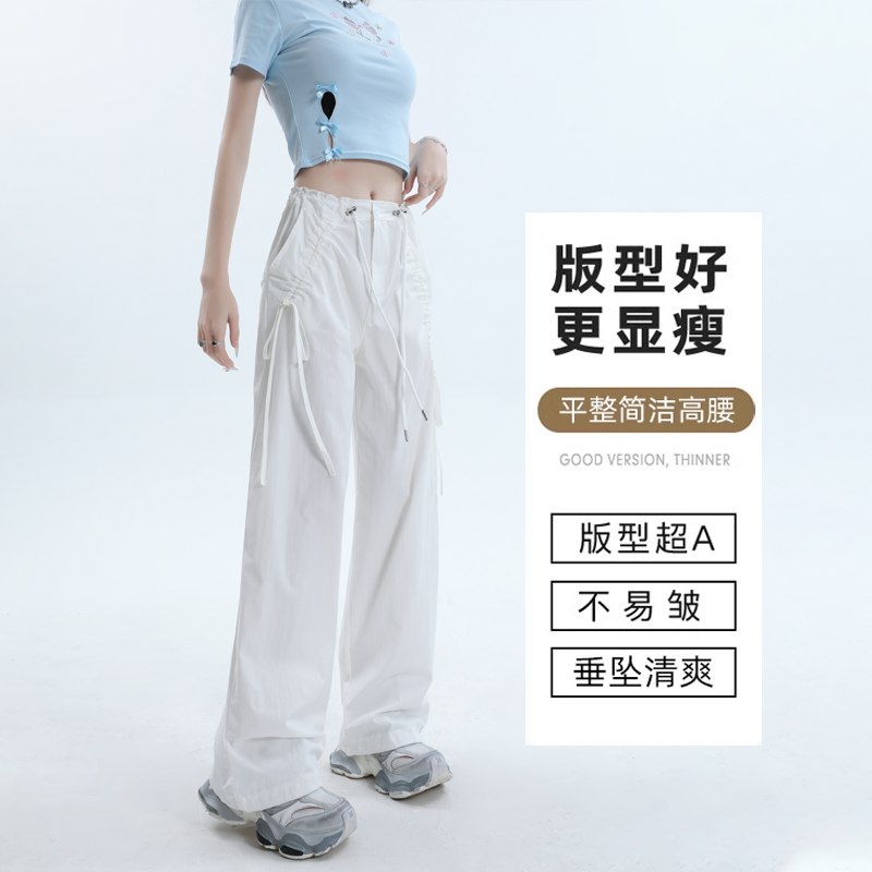 宽松显瘦抽绳设计感两穿休闲直筒拖地裤 浅色阔腿工装 薄款 女夏季 裤