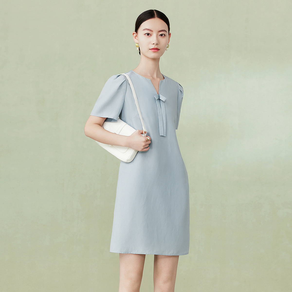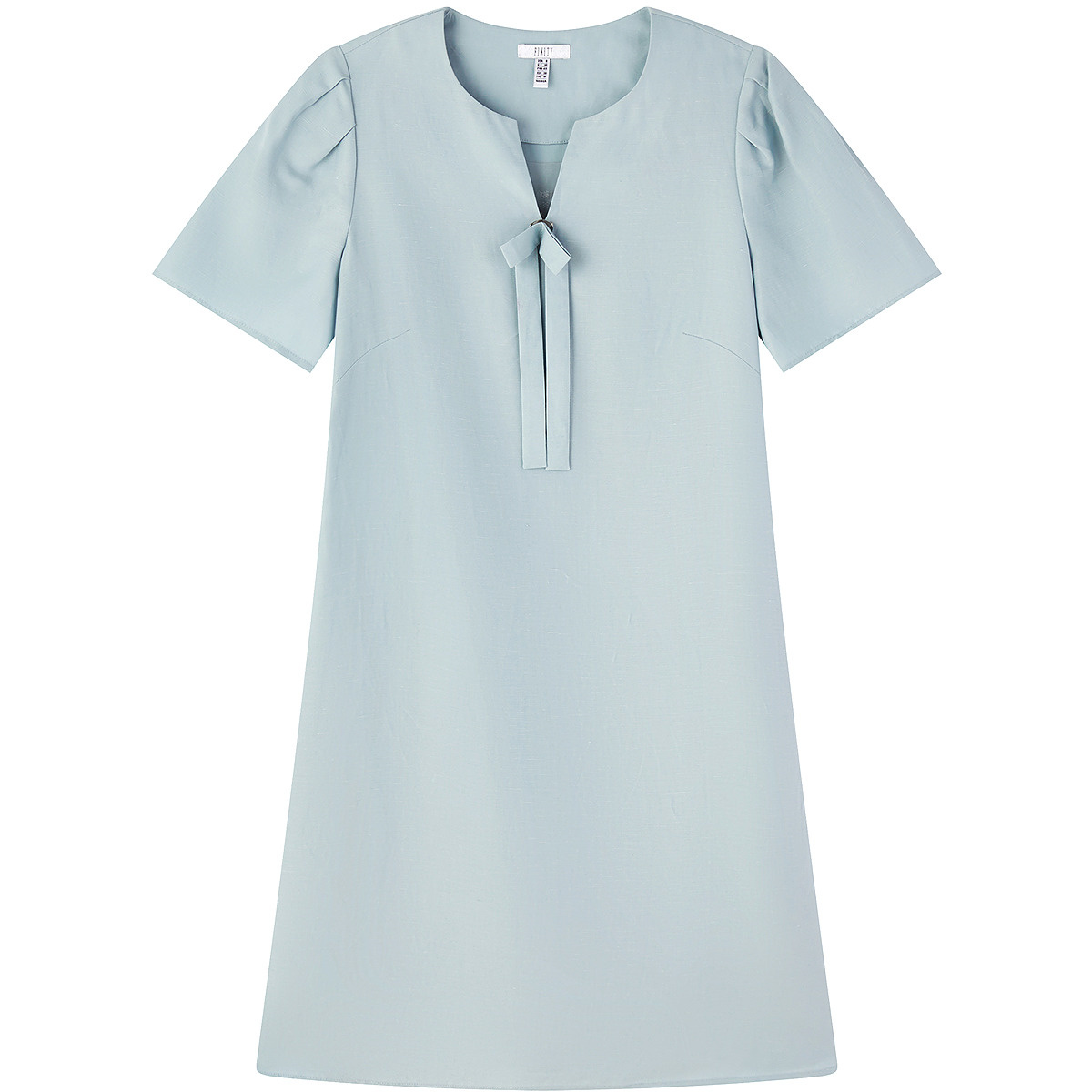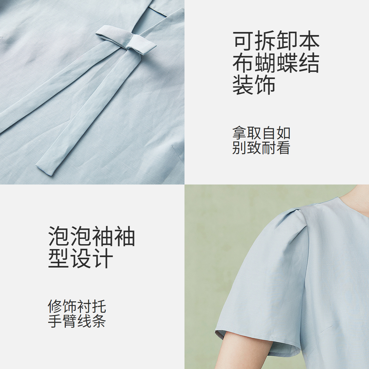 A字裙 设计感泡泡袖 FINITY菲妮迪天丝亚麻浅蓝连衣裙2024夏季 新款