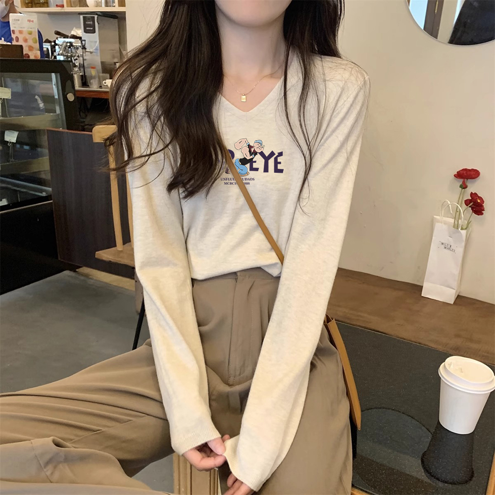 长袖 上衣2025减龄V领显瘦藏肉打底衫 t恤女式 款 宽松春秋季 纯棉薄款