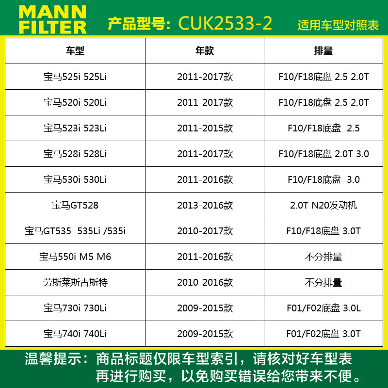 535 2适用宝马5系525 530 6系7系 528 曼牌空调滤芯CUK2533