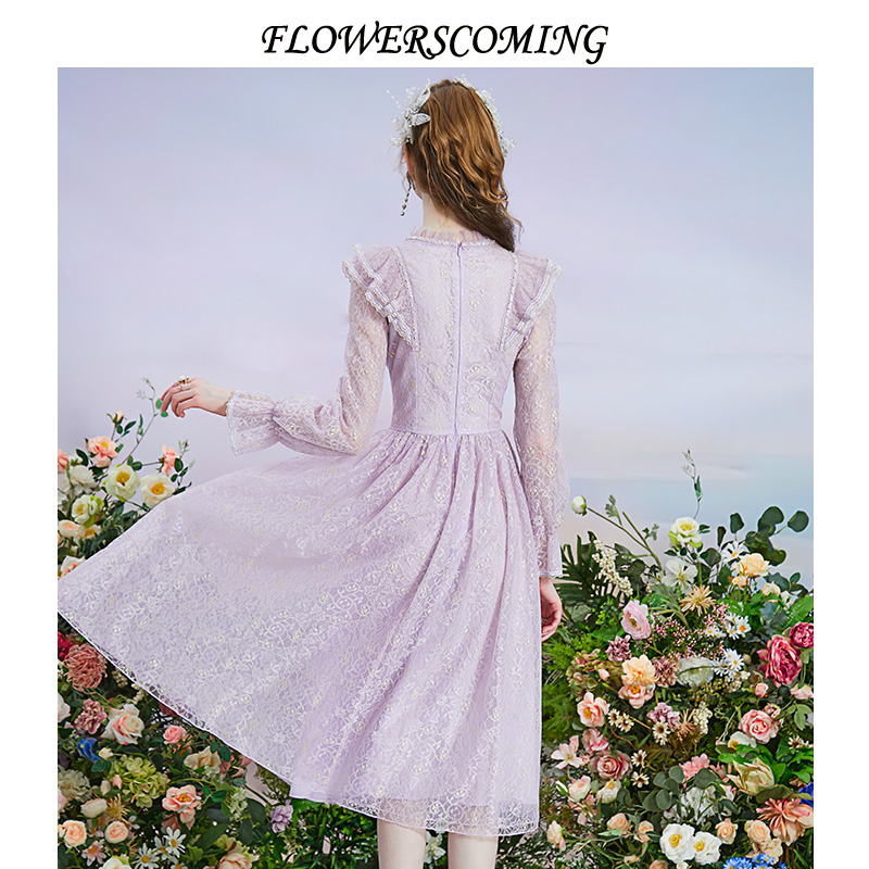 圆领蕾丝连衣裙女复古风荷叶花边公主裙 法式 花儿开了2025秋季 新款