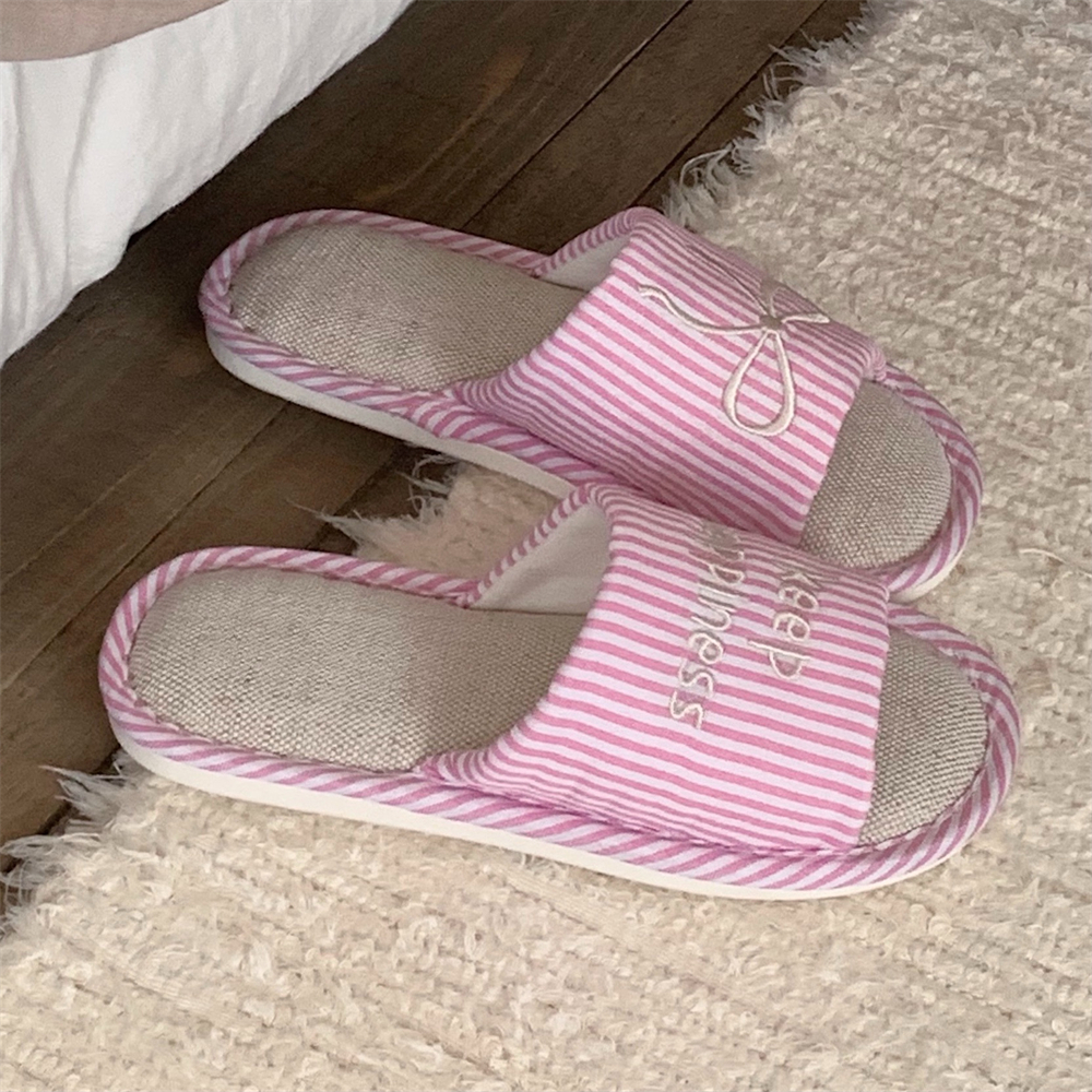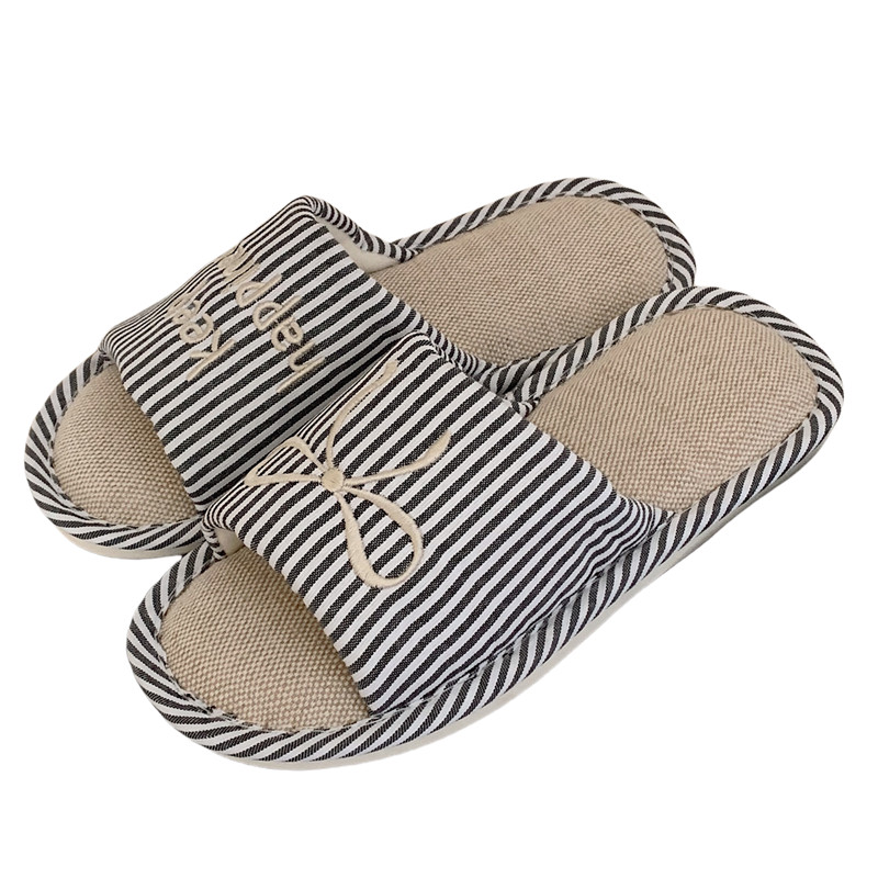 女 复古风蝴蝶结撞色亚麻拖鞋 轻便防滑吸汗四季 通用休闲居家地板鞋