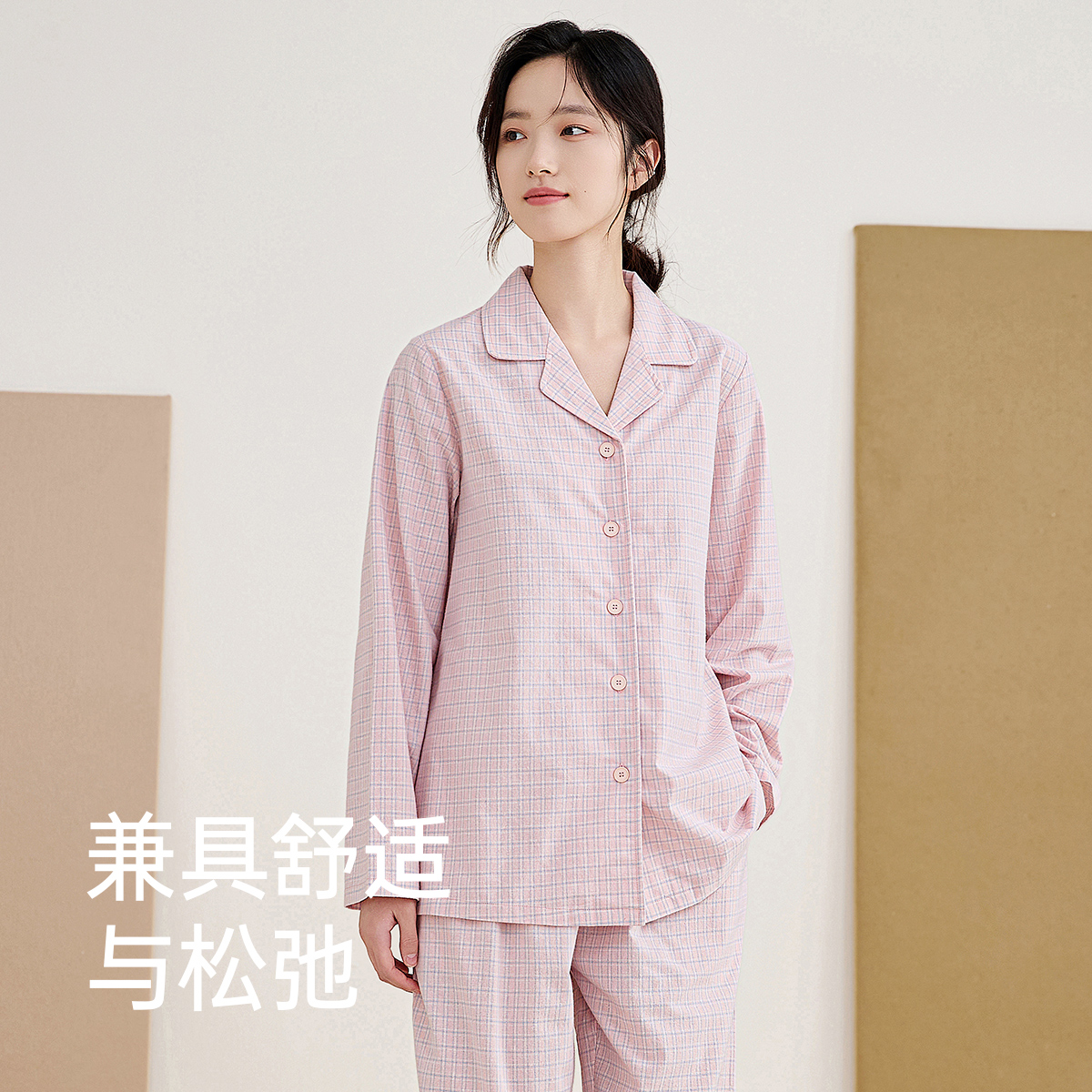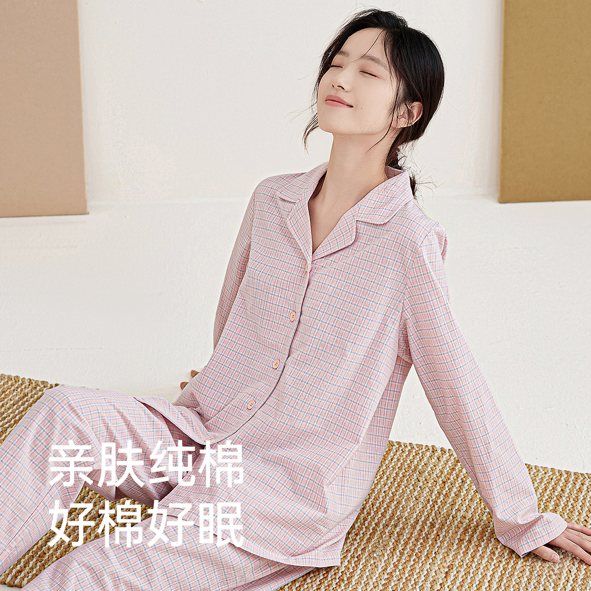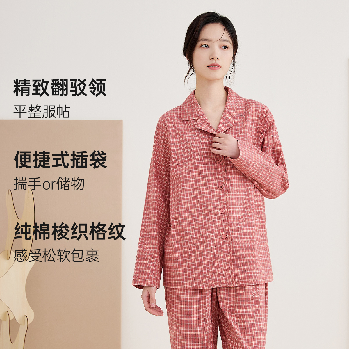 男士 顶瓜瓜睡衣女款 情侣家居服套装 纯棉梭织格纹长袖 春夏季