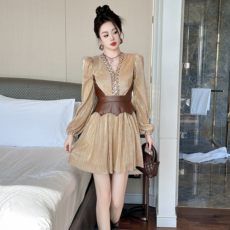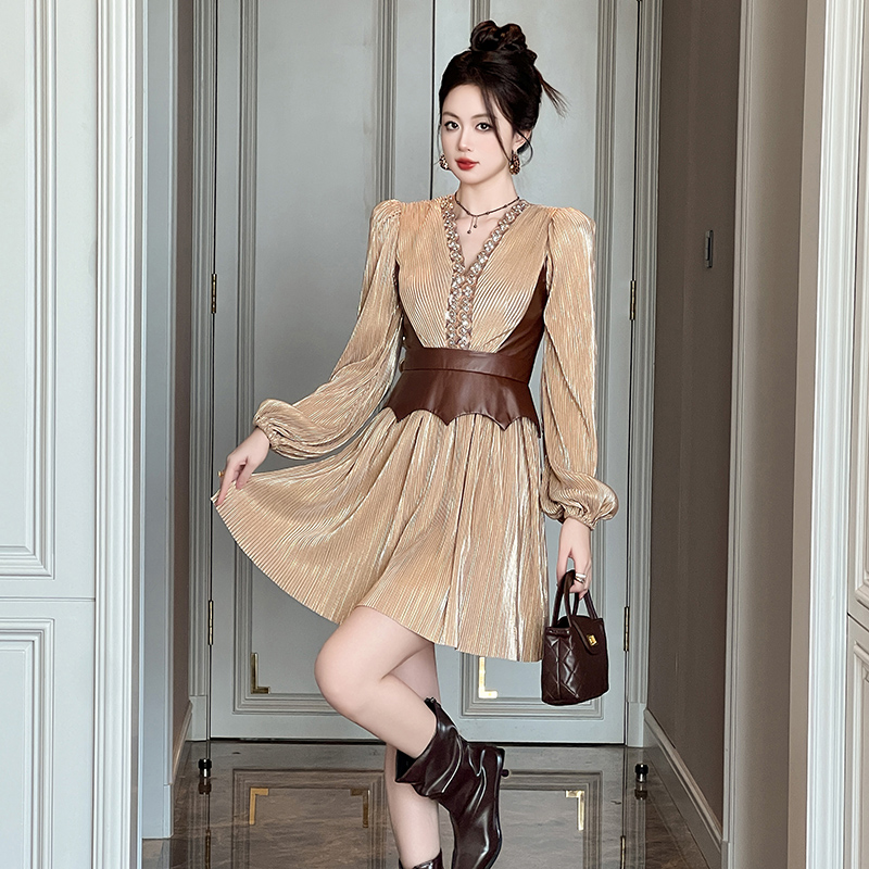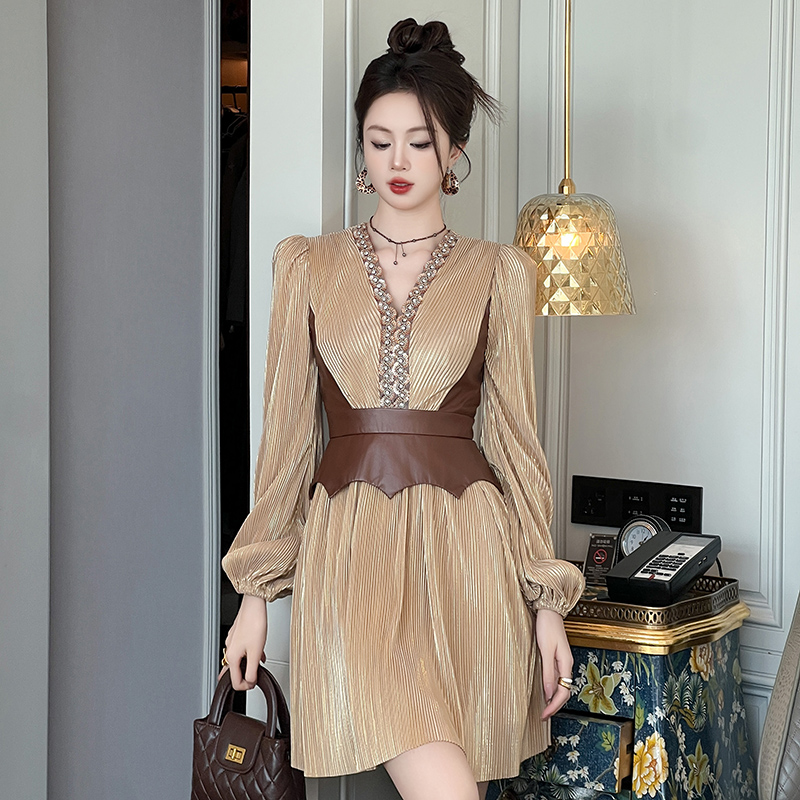 秋季 氛围感穿搭拼接丝绒连衣裙女端庄大气名媛风优雅收腰a字短裙