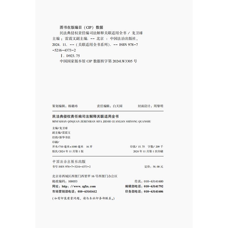中国法治出版 正版 龙卫球 民法典侵权责任编及司法解释关联适用全书 社9787521643732 2024新书