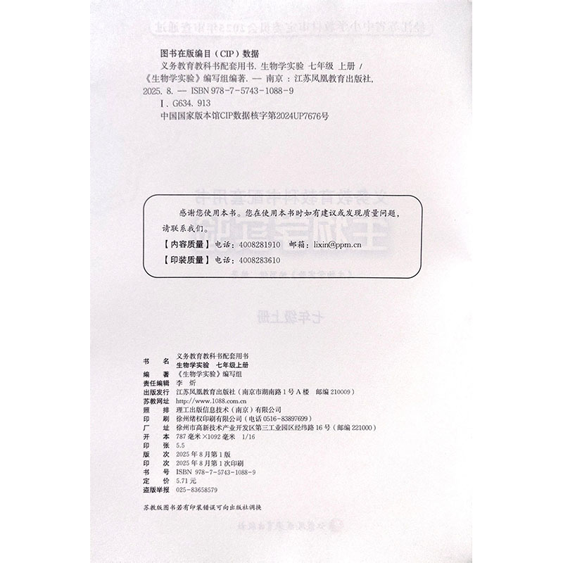2025年秋生物学实验7年级上8年级上册苏教版 社 七年级上册八年级上册江苏凤凰教育出版