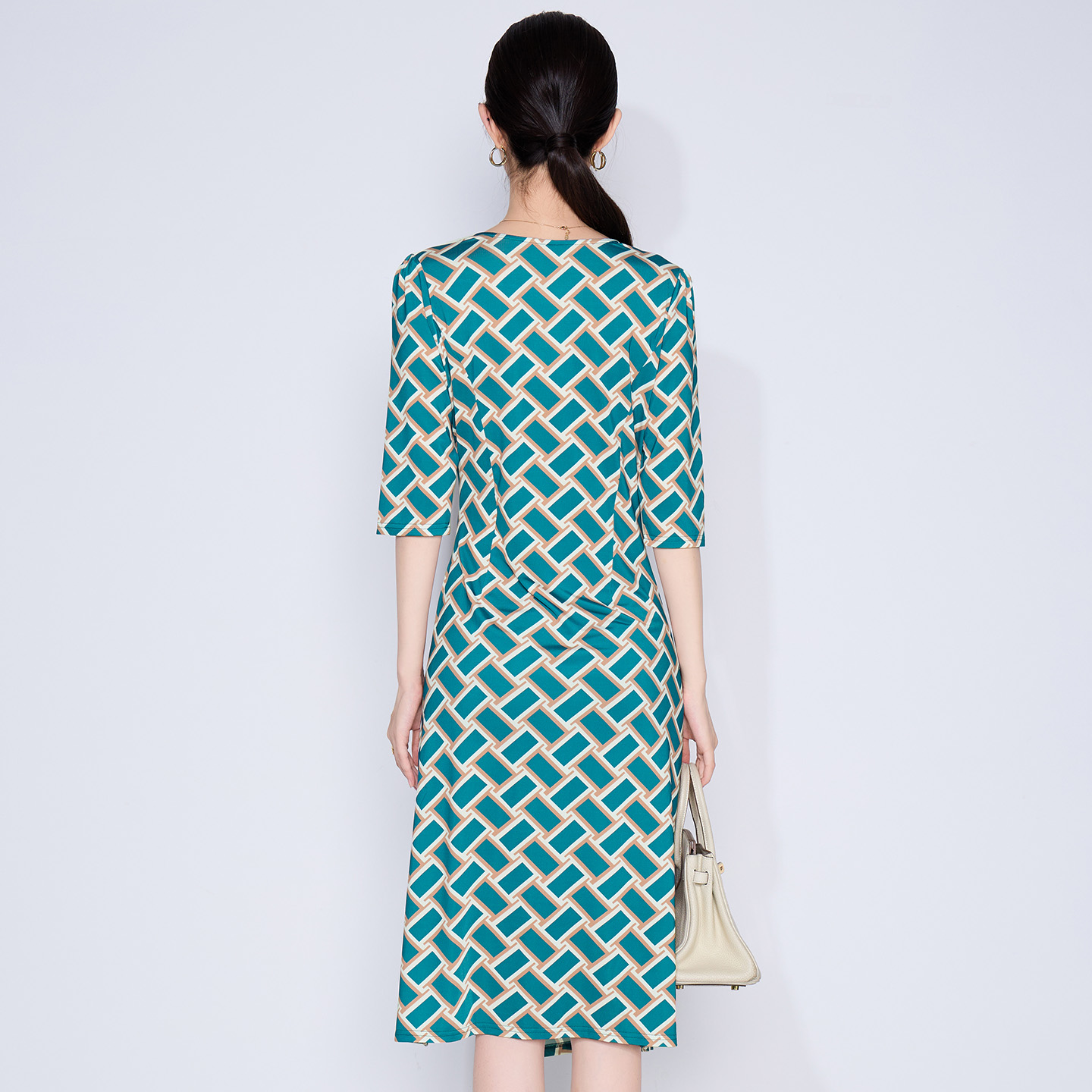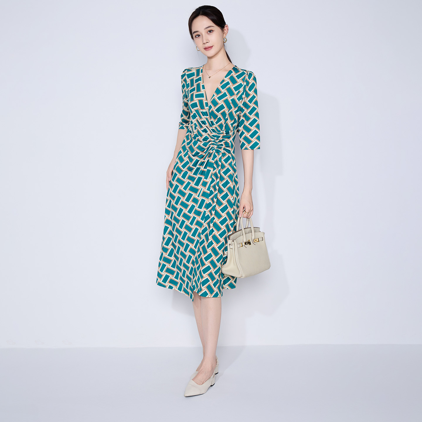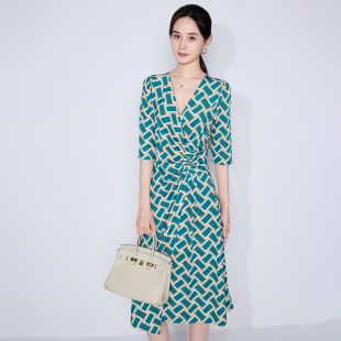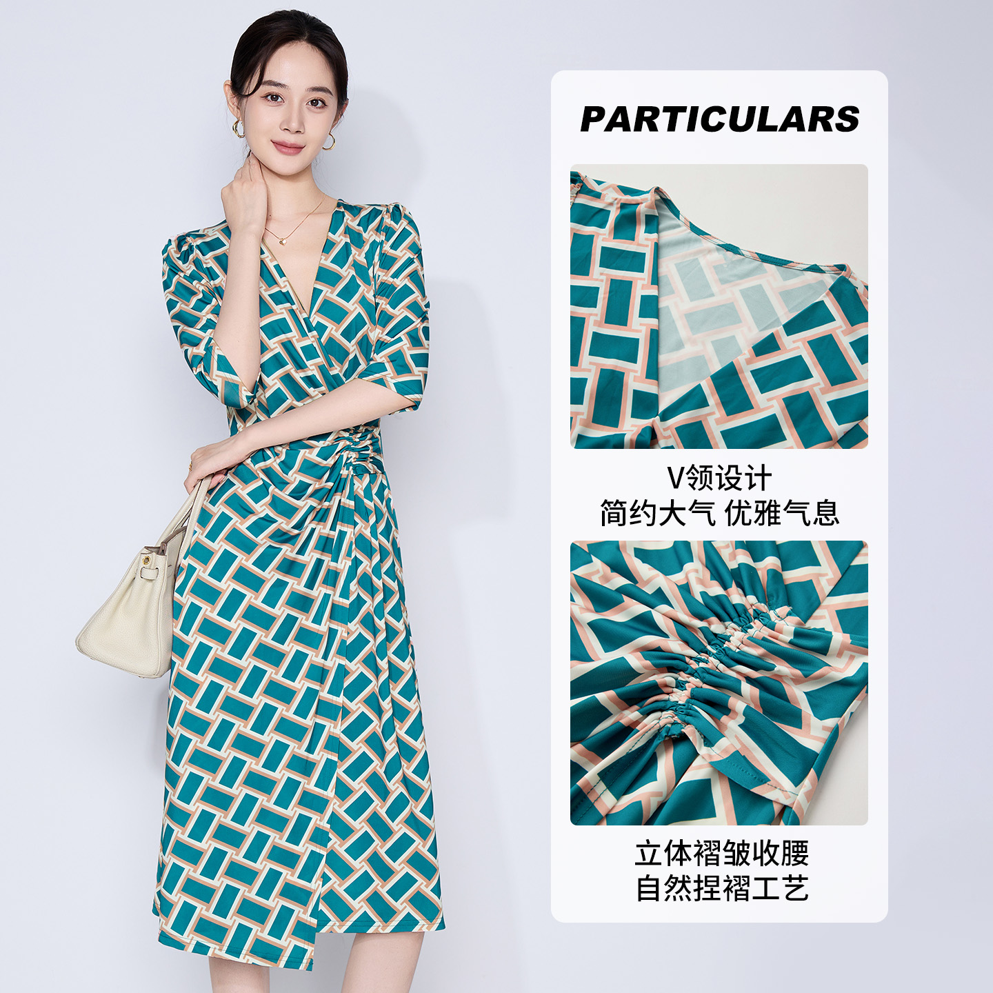 马天奴2025秋冬新款 气质 孔雀绿几何印花连衣裙子V领抓褶收腰短袖