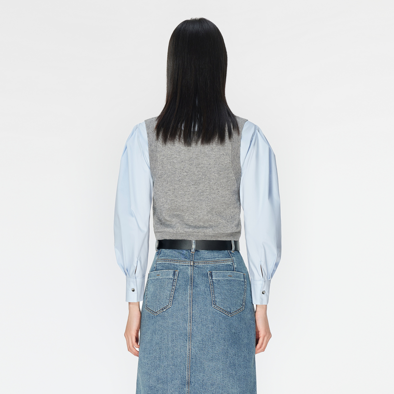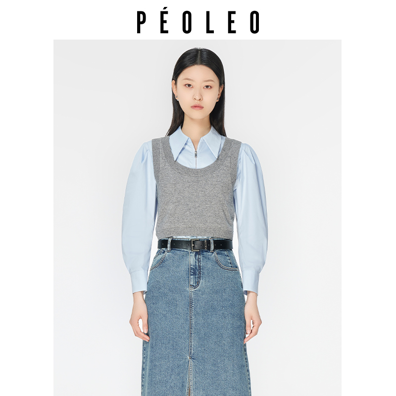 法式 女2025秋新款 学院风灰色针织马甲两件套上衣 衬衫 飘蕾拉链长袖