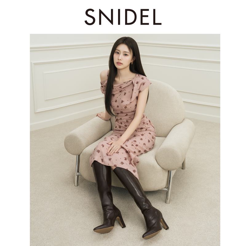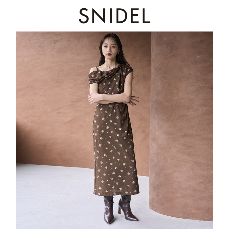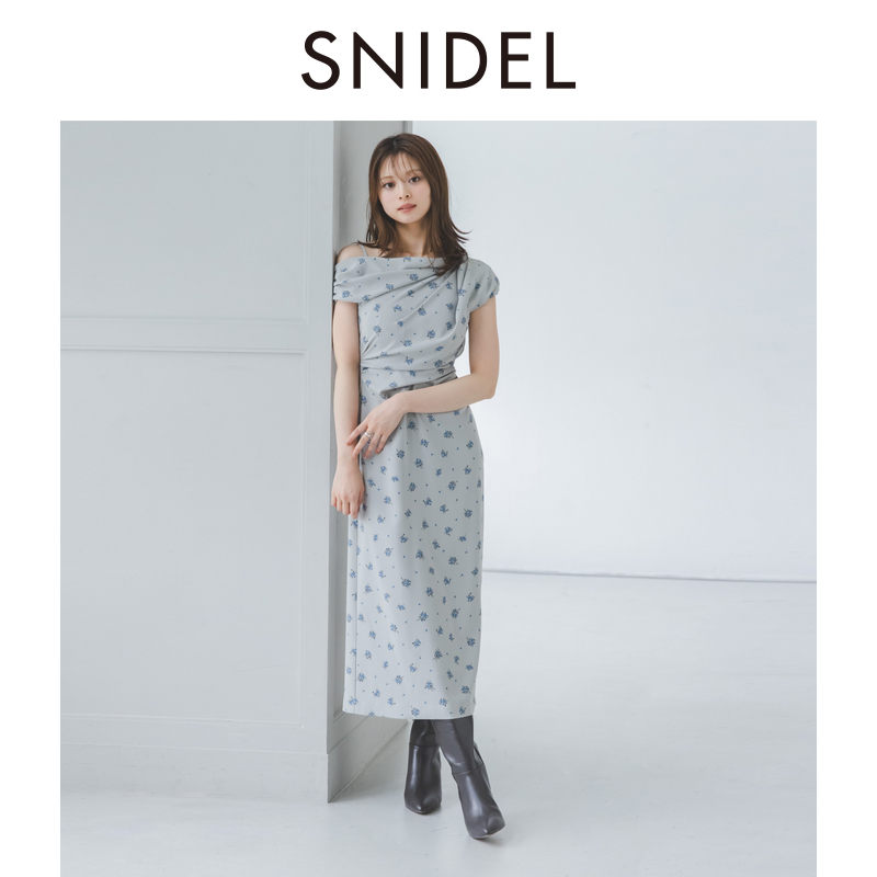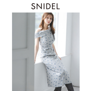 SNIDEL2025秋冬新品 连衣裙SWFO254132 甜美气质荡领斜肩印花短袖