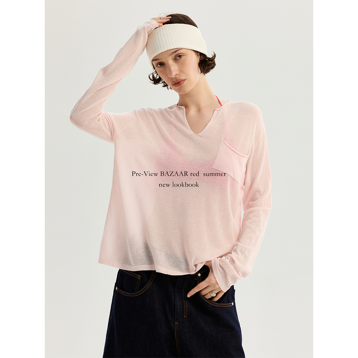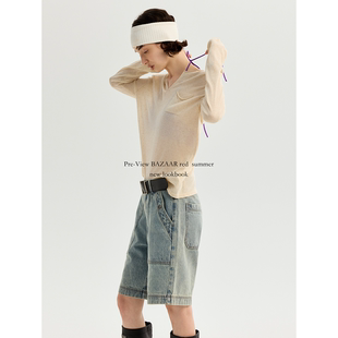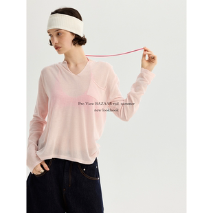 BAZAAR T恤女 RED芭莎红简约纯色百搭休闲v领微透显瘦宽松针织长袖