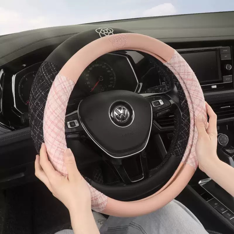 汽车方向盘套女四季 通用小香风简约棉麻吸汗防滑高级山茶花车把套