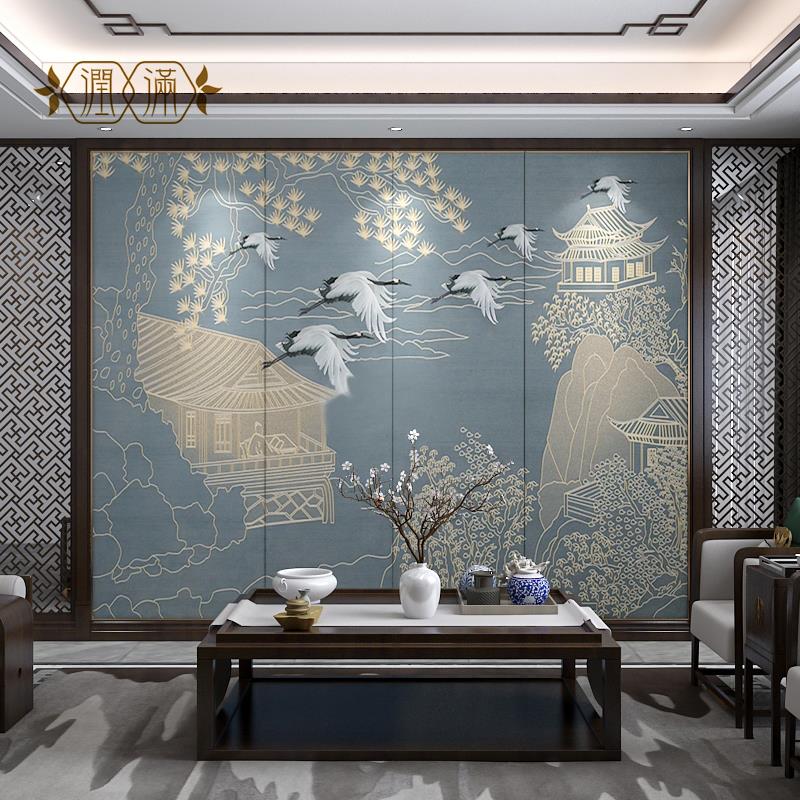 新中式 8D浮雕建筑仙鹤电视背景墙壁纸3d立体办公室客厅墙纸5D壁画