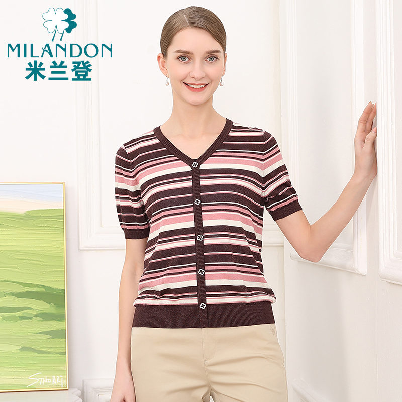 时尚 新款 条纹V领针织衫 女短袖 休闲薄 米兰登中老年妈妈装 毛衫 夏季