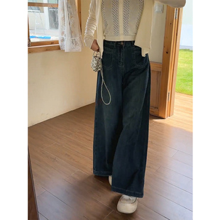 梨型 辣妹宽松显瘦垂感拖地直筒裤 深蓝色高腰阔腿牛仔裤 女春秋新款