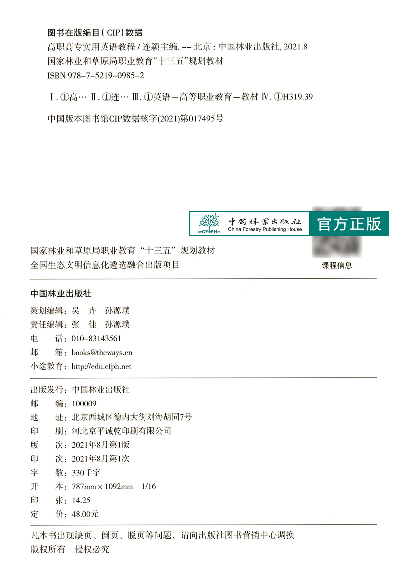 中国林业出版 高职高专实用英语教程 0985 国家林业和草原局职业教育十三五规划教材 社 连颖
