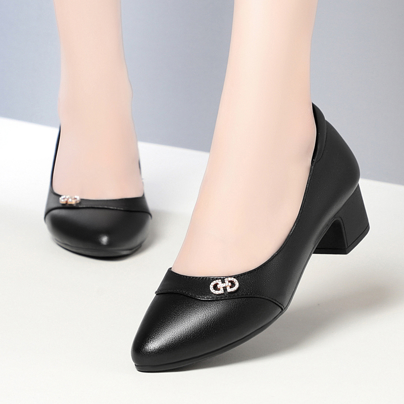 黑色女士工作不累脚妈妈鞋 软底中跟浅口皮鞋 软面单鞋 中年真皮女鞋