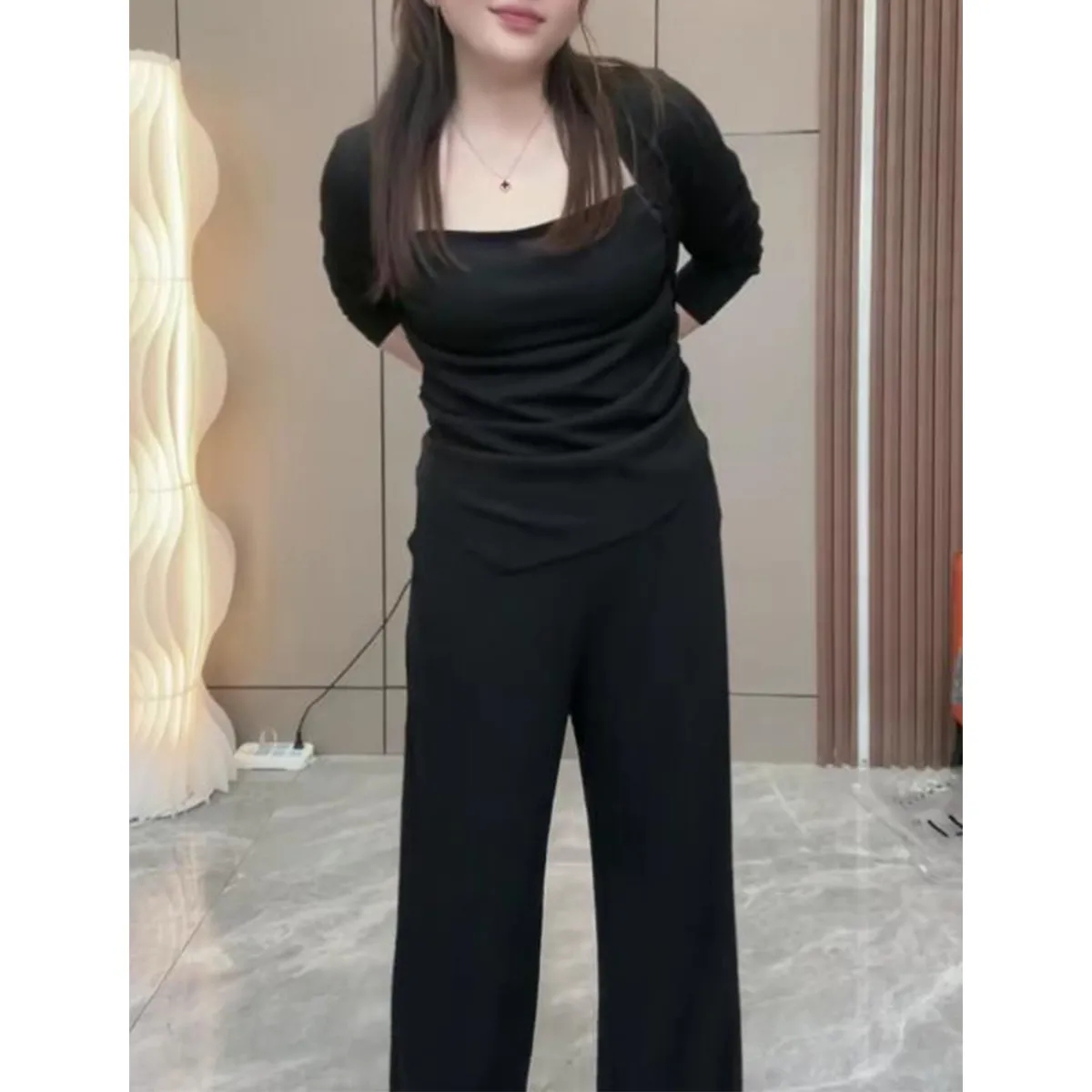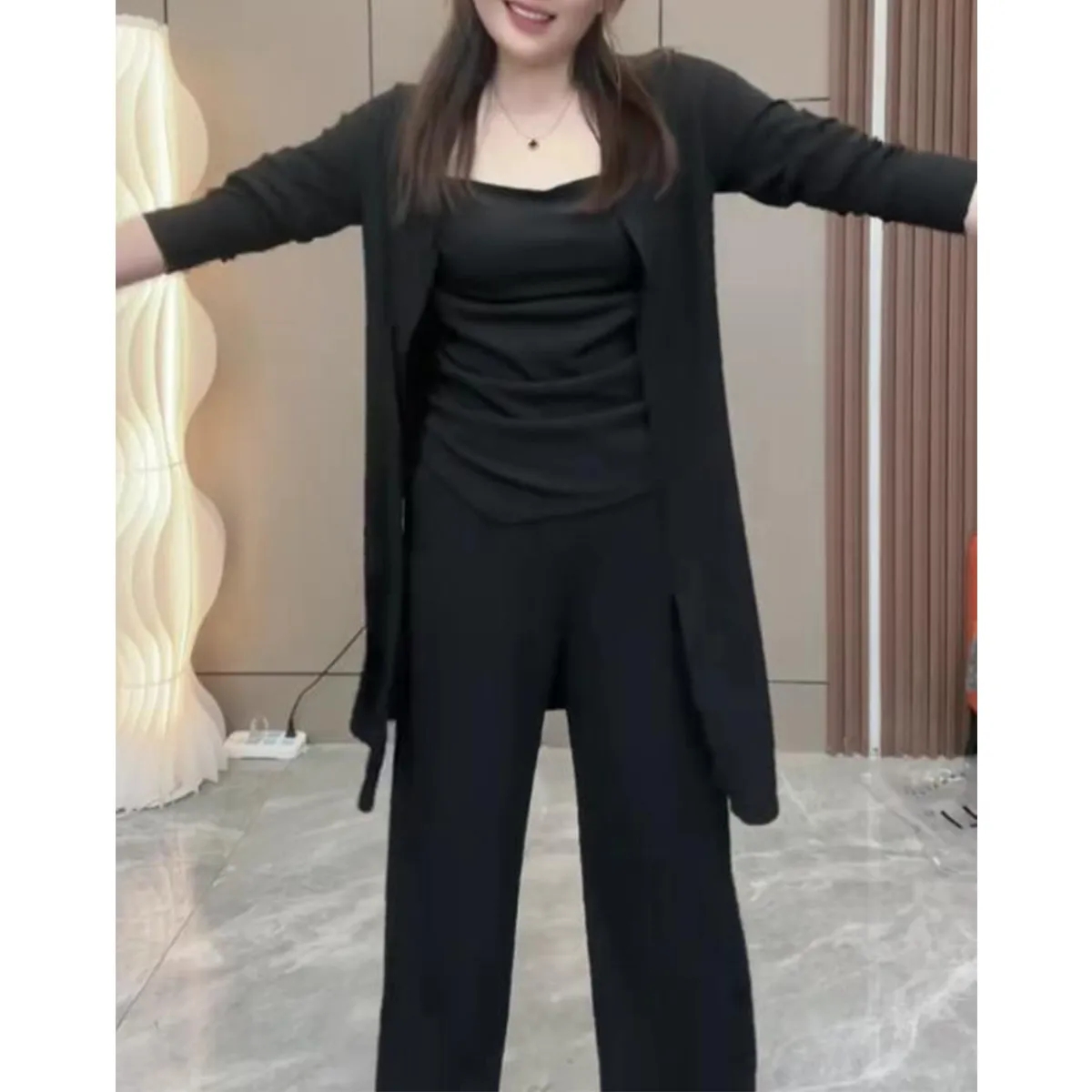 胖mm套装 大码 显瘦长袖 2025春季 外搭垂感直筒裤 时尚 开衫 三件套 新款
